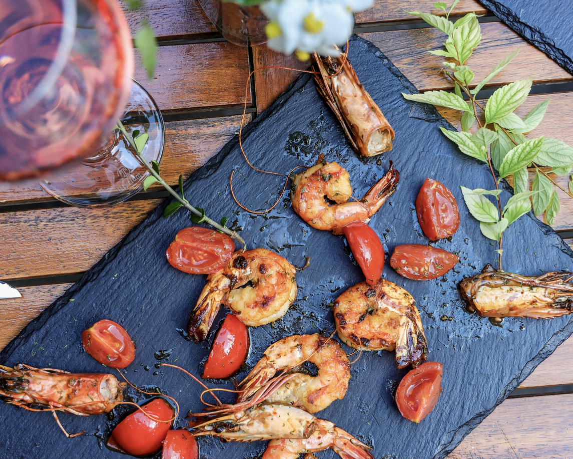 Joli mariage avec une cuisine exotique : Rougail, gambas snackés à la plancha.